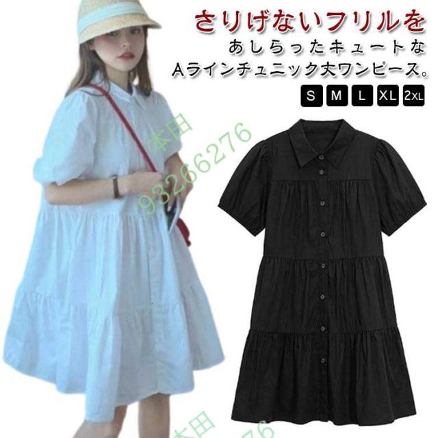 ワンピース チュニック シンプル Aライン ティアード ワンピース 春 夏 半袖 パフスリーブ 大人可愛い 大きいサイズ レディース シャツワンピース