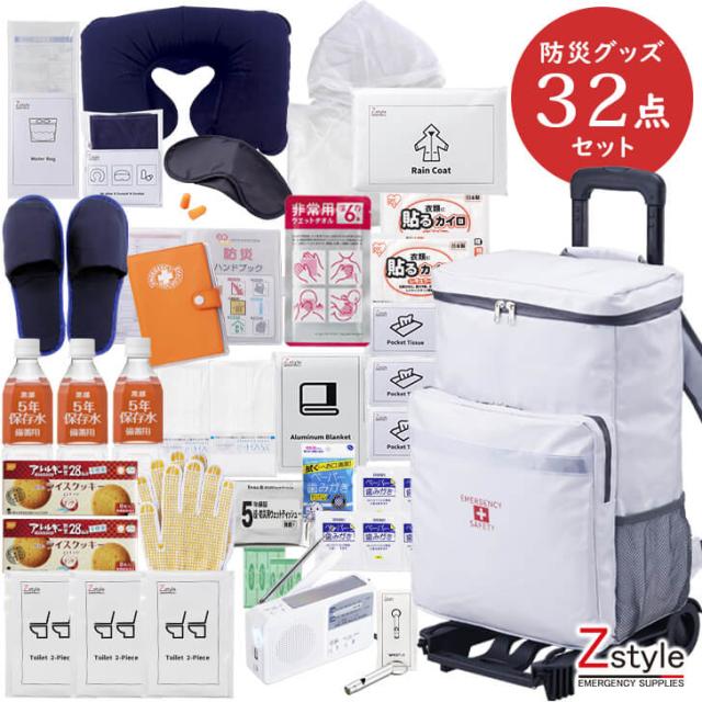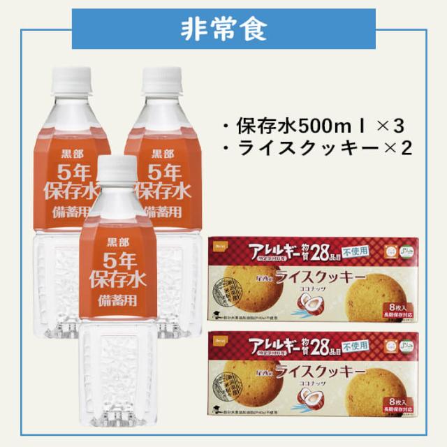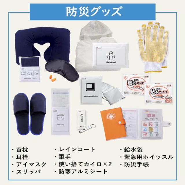 避難用ターポリンリュックバッグ、キャリーカート、ダイナモエマージェンシーライト、ホイッスル、防災手帳(ハンドブック・IDカード付き)、非常用トイレ2P×3、防寒アルミシート、ウェットティッシュ、ペーパー歯磨き5P、軍手、使い捨てカイロ×2、防寒レインコート、絆創膏(大小×各2)、非常用ウェットタオル、不織布マスク×2、首枕、耳栓、アイマスク、スリッパ、備蓄用飲料水500ml×3、ライスクッキー(※アレルギー物質28品目不使用)×2、ポケットティッシュ×3、給水袋(3L)