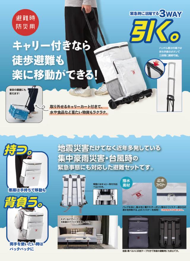 キャリーカートもついているので、重たい防災セットも楽に持ち運び可能。避難生活中でも重たい荷物(給水タンクや支援物資)を運ぶのにも役立ちます。