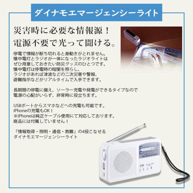 また、災害時の情報収集に必要なラジオを搭載したダイナモエマージェンシーライトもセット。スマホ充電(iPhoneも対応)・ラジオ・ライト・サイレンの4機能・ソーラー・ダイナモ・乾電池の3電源。