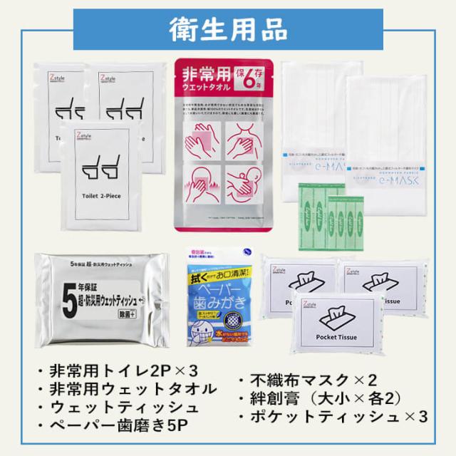避難先での過ごしやすさを考え、アルミシート・アイマスク・耳栓などの快眠グッズをセットし、ホイッスル・レインコートなどの安全避難用品や、マスク・ボディタオル、ウェットティッシュ・ペーパー歯磨きを含む衛生用品等幅広くセット。