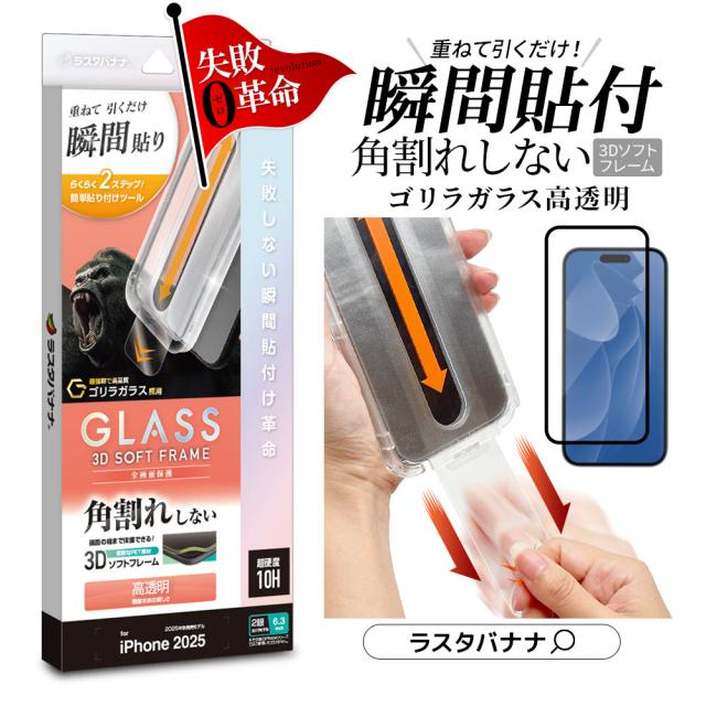iPhone17 iPhone17 Pro ガラスフィルム 全面保護 高光沢 高透明 クリア ゴリラガラス採用 貼付革命 貼り付け革命 瞬間張り 失敗しない レボリューション 角割れしない ソフトフレーム 硬度10H アイフォン 保護フィルム ラスタバナナ