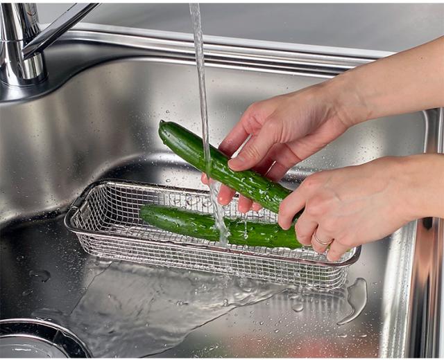 ・丸いザルでは洗いにくいきゅうりやほうれん草などの長めの食材も洗いやすいです。