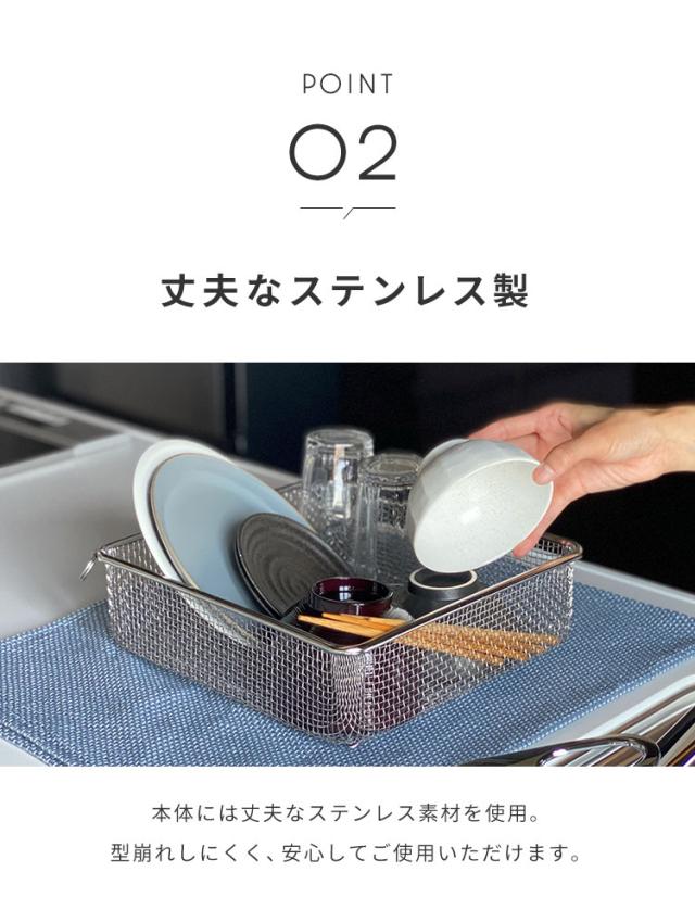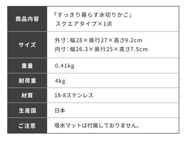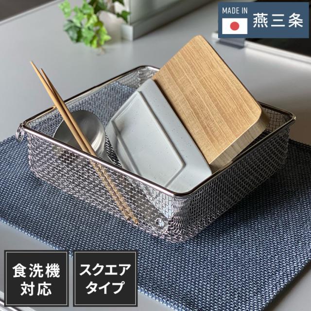 日本製 燕三条 すっきり暮らす水切りかご スクエア 吸水マットに合わせて使える 食洗機対応 ステンレス 水切りカゴ バスケット コンパクト 頑丈 おしゃれ【送料無料】