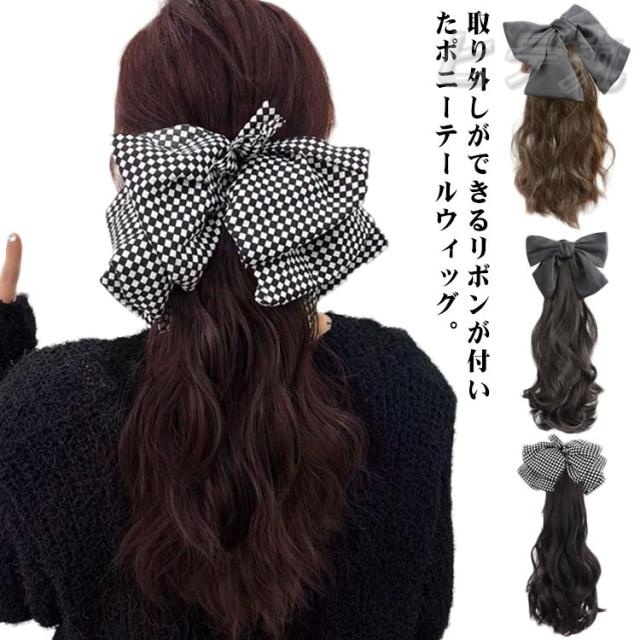 ポニーテール ウィッグ ワンタッチ ポイントウィッグ ウェーブ リボン付き 巻き ロングウィッグ カール ゆるウィッグ つけ毛 クリップ エクステ かつら 部分 ナチュラル ビッグリボン 韓国ファション