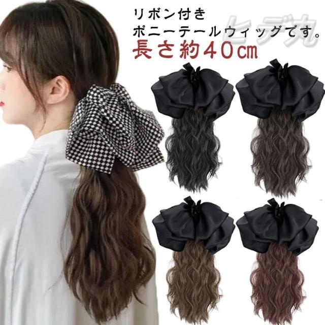 ポニーテール ウィッグ ビッグリボン付き ロング ウィッグ 部分ウィッグ つけ毛 付け毛 簡単装着 リボン付きポニーテールウィッグ イベント コスプレ 仮装 初心者 女子力アップ 結婚式 2次会 パーティー 成人式 クリップタイプ 選べる2タイプ 全4色