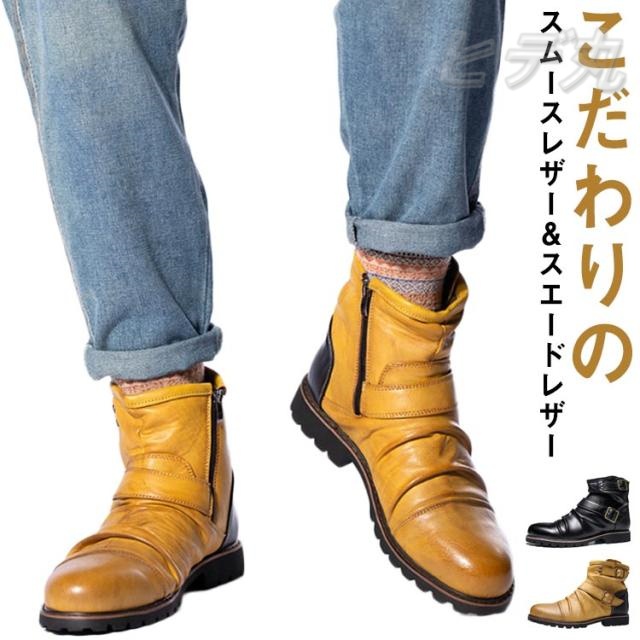 ブーツ メンズ エンジニアブーツ ドレープ ショート サイドジップ タンクソール PUレザー 合成皮革 黒 ブラック ブラウン おしゃれ 秋 冬 大きいサイズ 235-290mm
