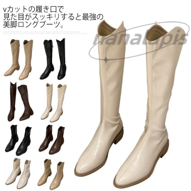 ジョッキーブーツ レディース ロングブーツ Vカット バックジップ ニーハイ ニーハイブーツ ローヒール ポインテッドトゥ ブーツ 美脚 シューズ PUレザー 合皮 ロング丈 裏起毛 秋冬 滑り止め 韓国風 大人 トレンド モテ女子 大人女子 歩きやすい 痛くない 防寒 冷え性対策