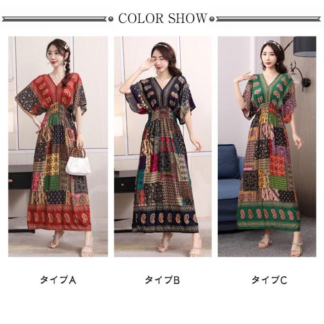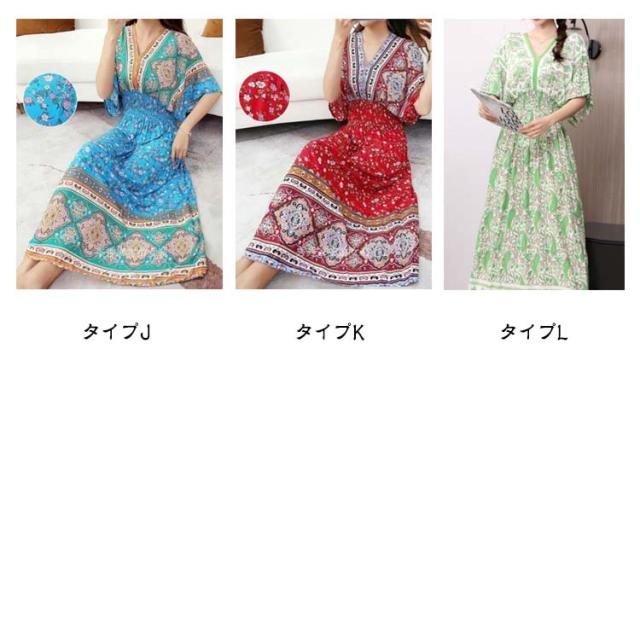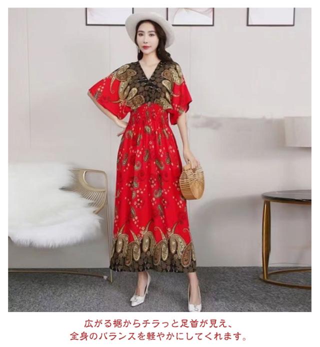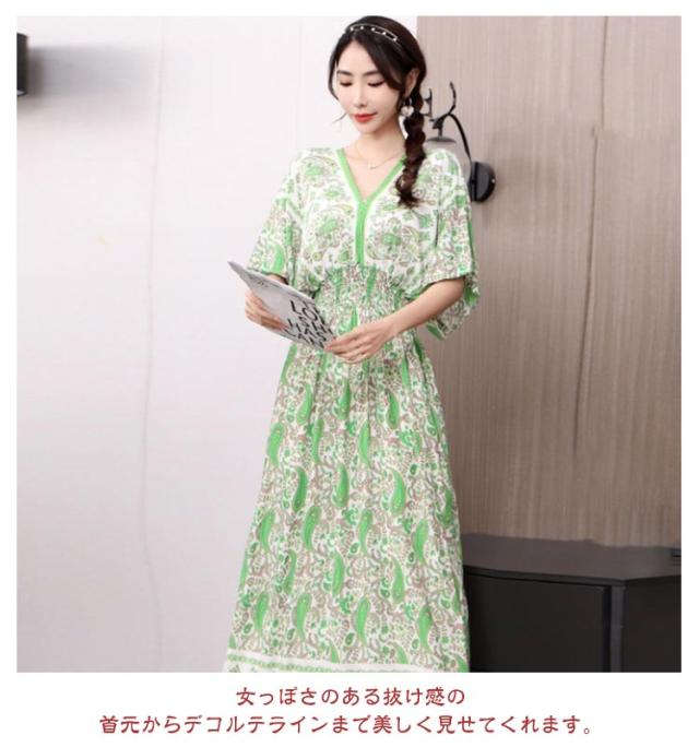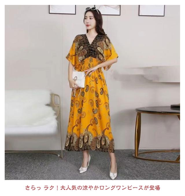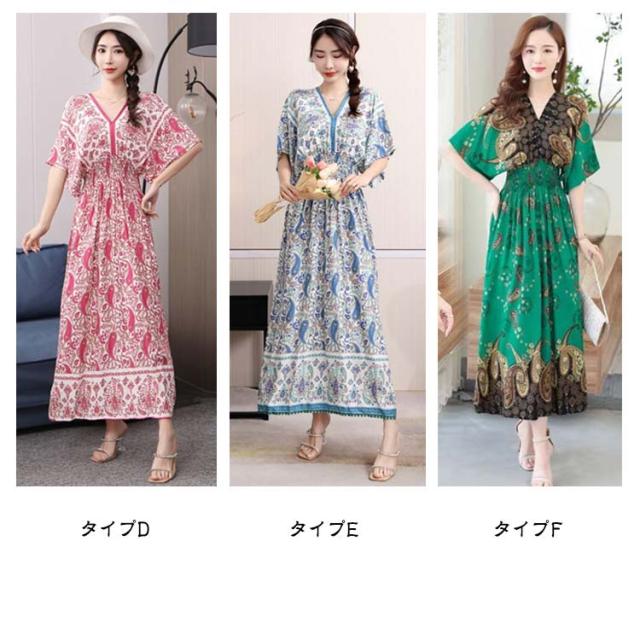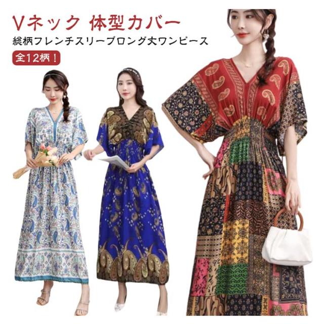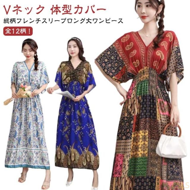 夏柄ワンピース レディース ワンピース 春夏 Vネック ペイズリー柄マキシ ボタニカル柄マキシ 洗える 体型カバー 柄ワンピ 大人 軽い ロング丈マキシ 総柄 タイル柄 ロング丈マキシワンピース リゾート リラックス フレンチスリーブ 半袖 カットソー ウエストゴム 送料無料