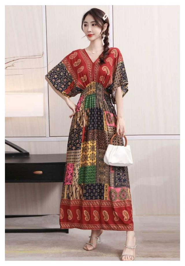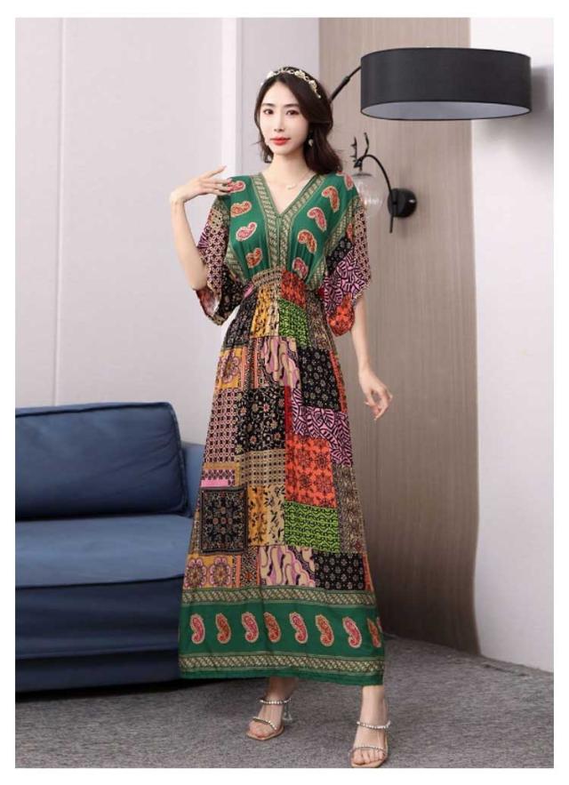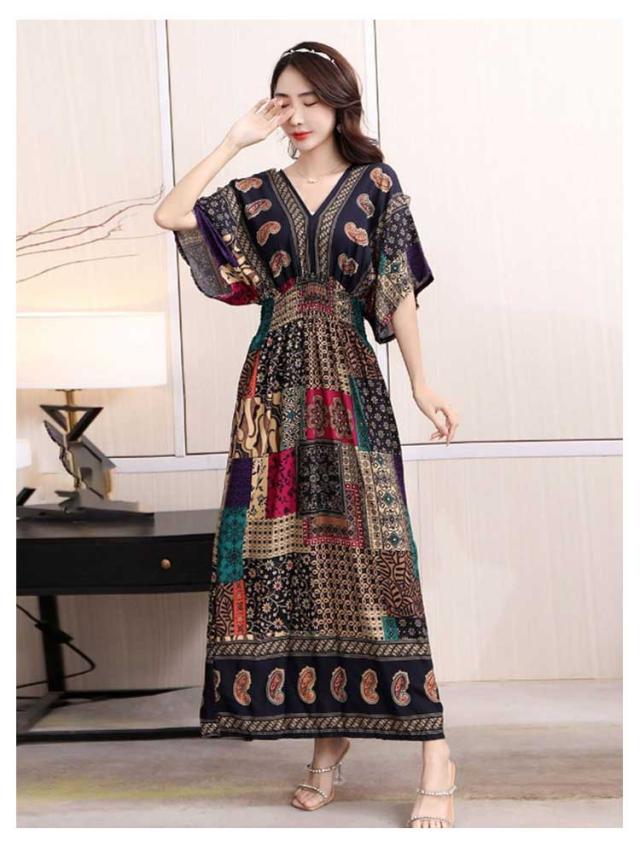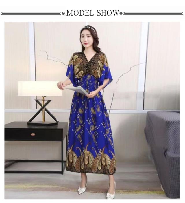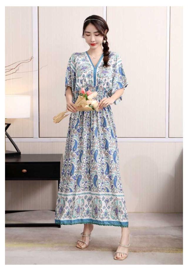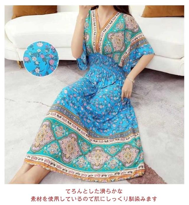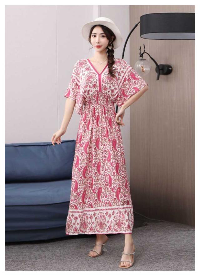 夏柄ワンピース レディース ワンピース 春夏 Vネック ペイズリー柄マキシ ボタニカル柄マキシ 洗える 体型カバー 柄ワンピ 大人 軽い ロング丈マキシ 総柄 タイル柄 ロング丈マキシワンピース リゾート リラックス フレンチスリーブ 半袖 カットソー ウエストゴム 送料無料