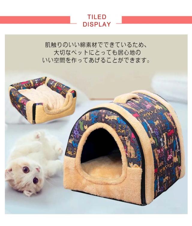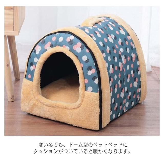 | もぐりこむ猫や犬の習性で、ドーム型の出入りしやすいペットハウスにしました。 肌触りのいい綿素材でできているため、大切なペットにとっても居心地のいい空間を作ってあげることができます。 ドーム型な設計は保温性が高く、しっかりとペットちゃんを包まれて、冬の寒さはもう怖くない! 付属のふわふわなクッションを入れて、ペットベッドとして、遊ぶ同時に心地よく寝ることもできます。 暑い夏には、屋根を押し下げて瞬間にベッドになる2WAYで利用されます。 寒い冬でも、ドーム型のペットベッドにクッションがついていると暖かくなります。 | |