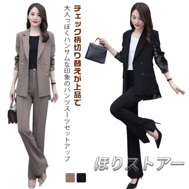 細身 セットアップ セットアップ パンツスーツ チェック柄 通勤 スラックス 切り替え レディース テーラードジャケット 裾スリット セミフレアパンツ スリム ママスーツ 卒業式 レディース カジュアル おしゃれ 着?せ 大人女性 ギフト プレゼント