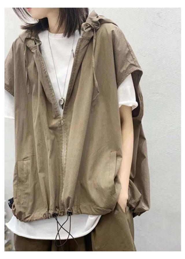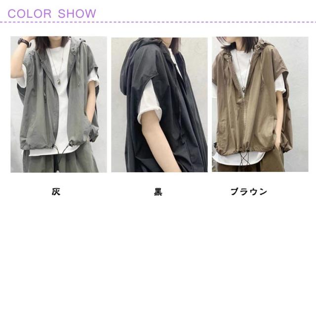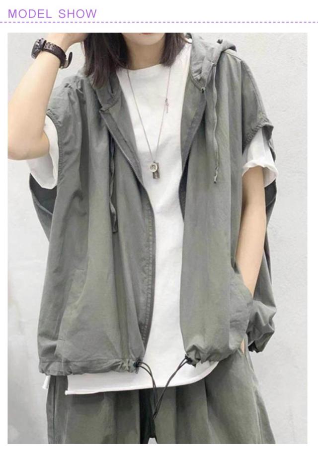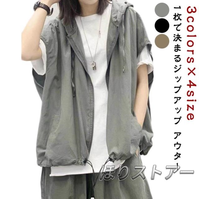 トップス カジュアル 切り替え フード付き きれいめ 送料無料 涼しい 半袖 おしゃれ ベスト ゆったり ジップアップ レディース トップス 1枚で決まる 春 アウター 春夏 半袖パーカー シンプル 春夏 グレー ブラック 黒 ブラウン
