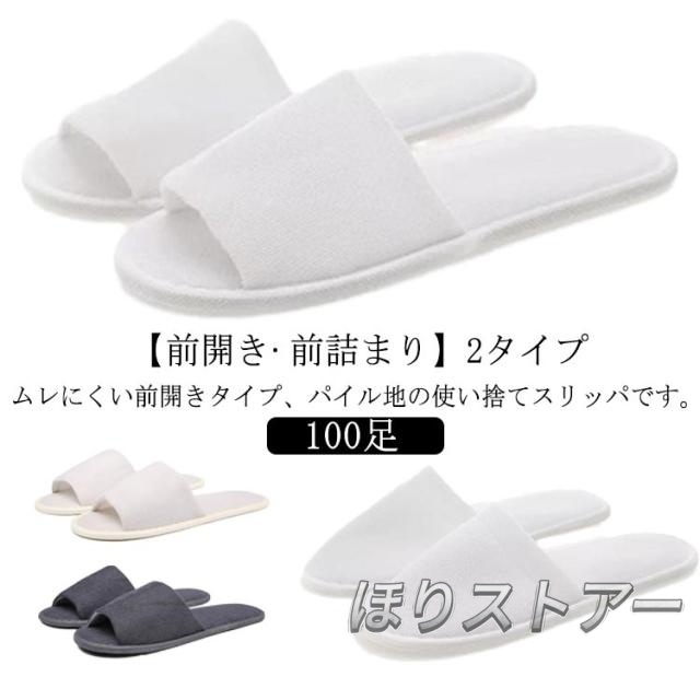 | ムレにくい前開きタイプ、パイル地の使い捨てスリッパです。【100足】【前開き?前詰まり】2タイプ 1足ずつ包装されています。 来客用、ホテル室内、クリニック、美容サロン、マッサージ店等に最適です。 衛生的で安心な個包装・使い捨てタイプです。 | |