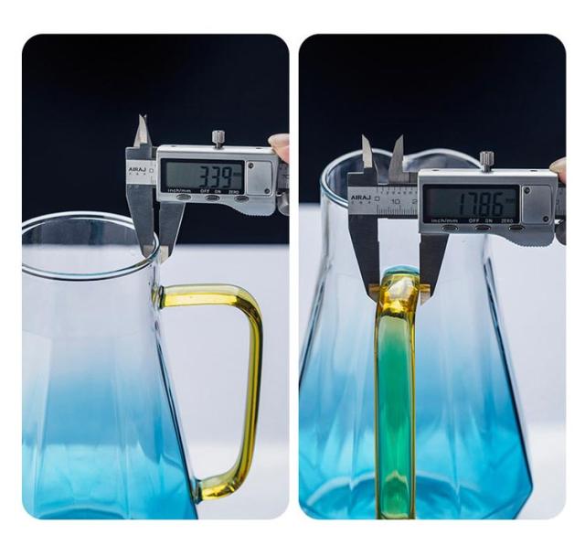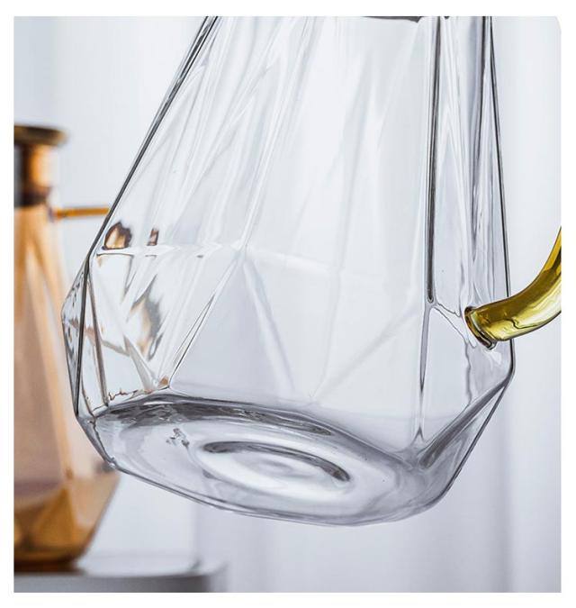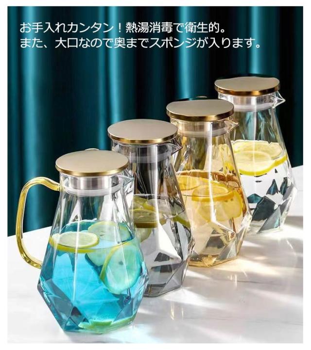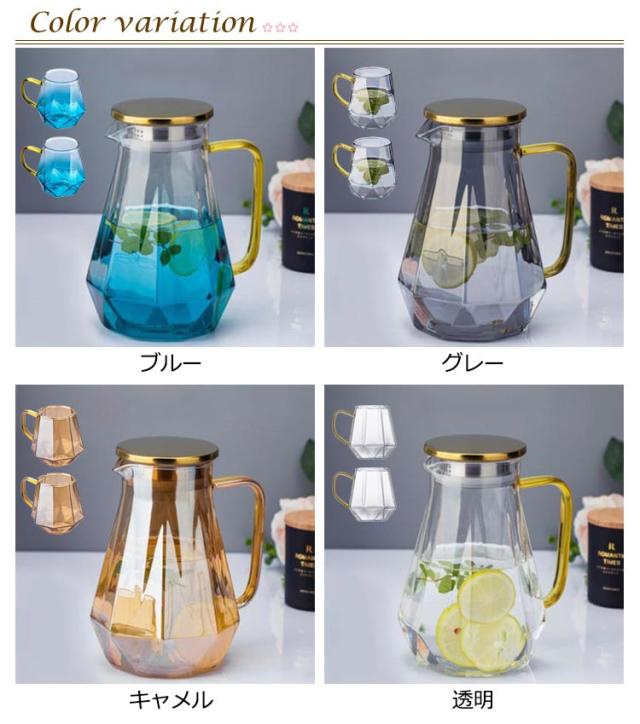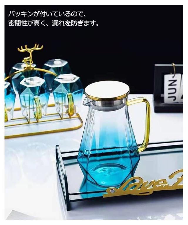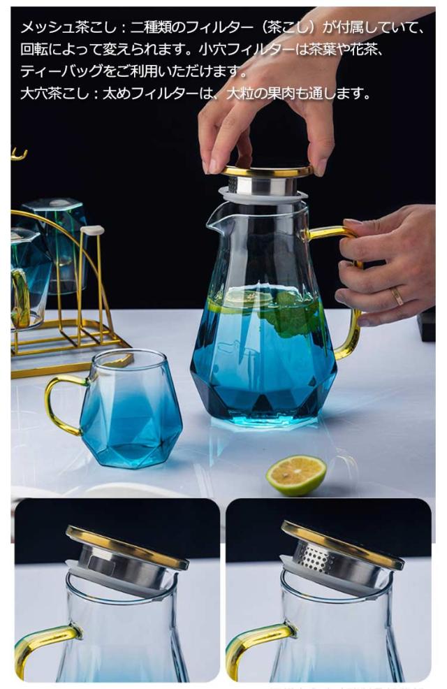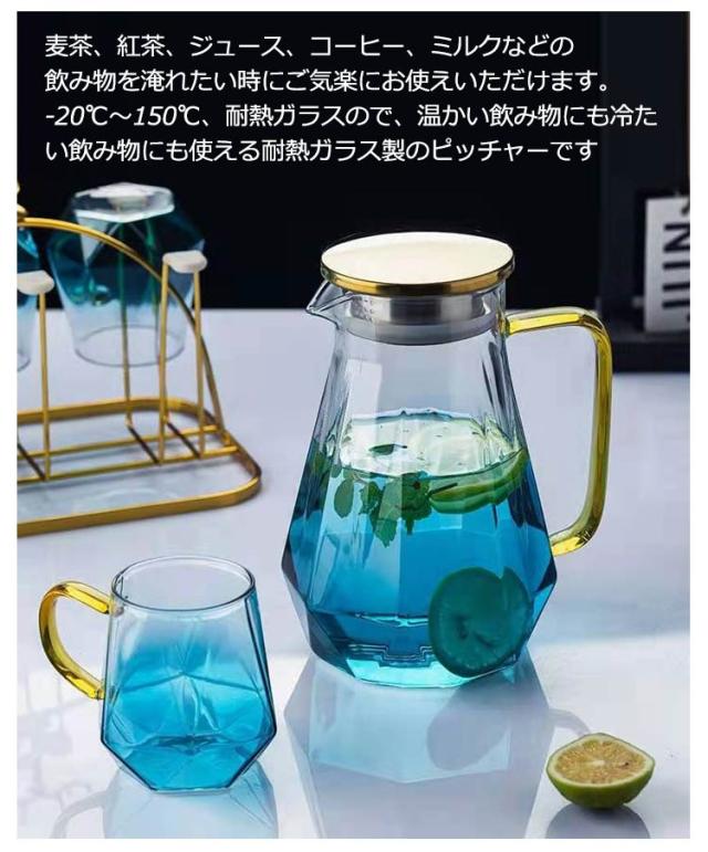 | ホウケイ酸ガラス製のダイヤモンドカットデザインのピッチャー。【同色コップ2個付き】 この水差しは、ダイヤモンドのアイデアでデザインされており、エレガントで美しいです。 耐熱のホウケイ酸ガラスで作られて、ビーカーと同じ材質で、直火可能なガラスポットです お手入れカンタン!熱湯消毒で衛生的。また、大口なので奥までスポンジが入ります。 麦茶、紅茶、ジュース、コーヒー、ミルクなどの飲み物を淹れたい時にご気楽にお使えいただけます。-20℃?150℃、耐熱ガラスので、温かい飲み物にも冷たい飲み物にも使える耐熱ガラス製のピッチャーです メッシュ茶こし:二種類のフィルター(茶こし)が付属していて、回転によって変えられます。小穴フィルターは茶葉や花茶、ティーバッグをご利用いただけます。大穴茶こし:太めフィルターは、大粒の果肉も通します。 指でしつかりと握ることができる、ゆったりとしたハンドル。大きな手でも小さな手でも、持つ位置を限定することのない、安定感のある使い心地。 パッキンが付いているので、密閉性が高く、漏れを防ぎます。 | |