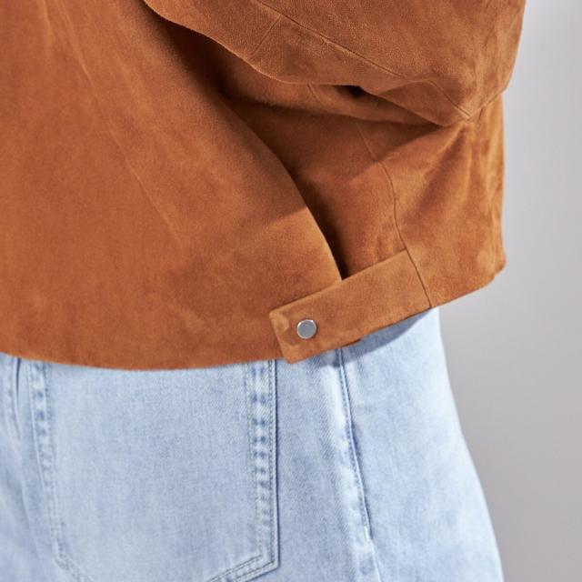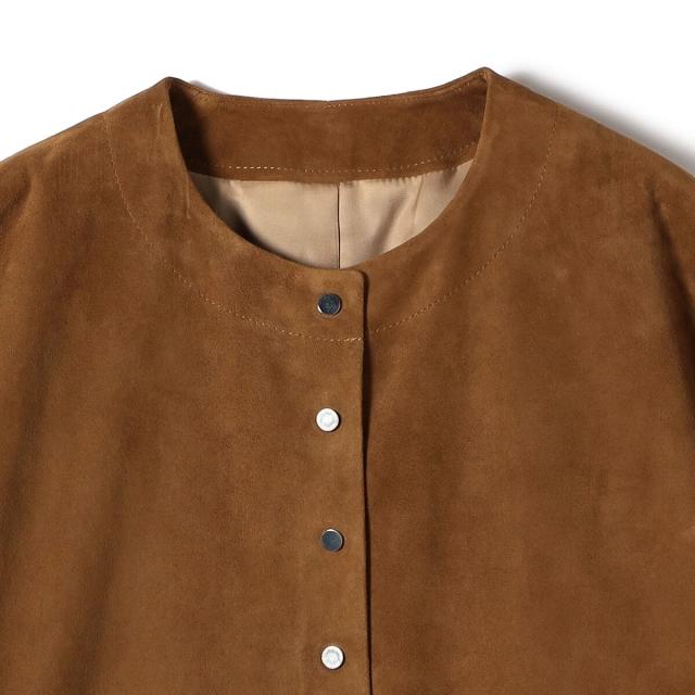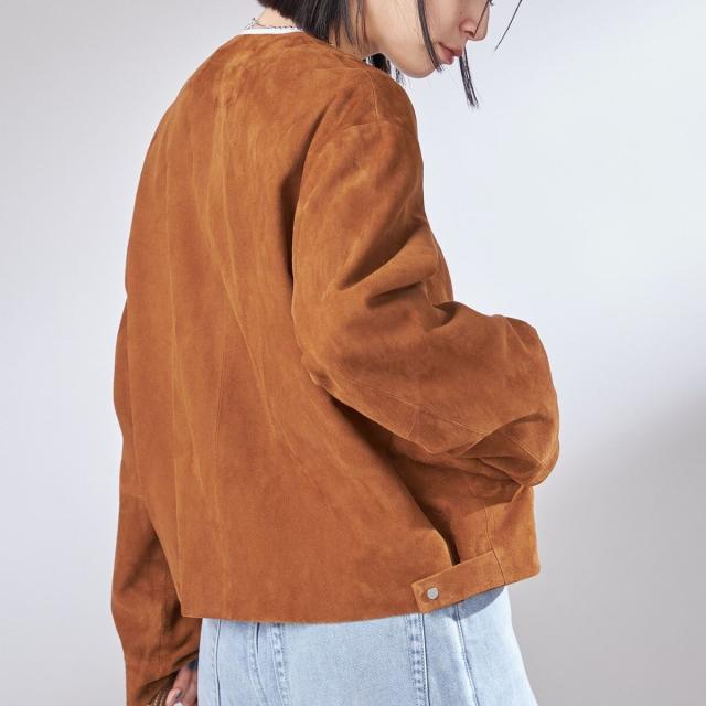 女性らしいノーカラーデザインで、ハードすぎず上品に着られるスエードジャケット。