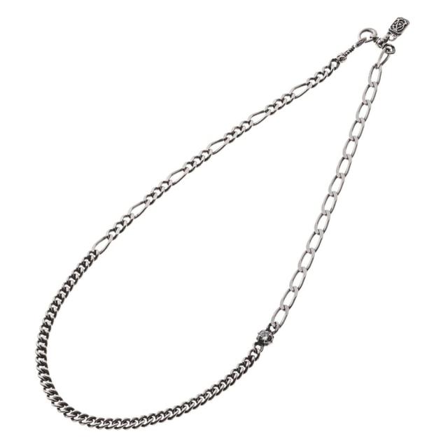 喜平・フィガロ・ロング喜平の三種を緻密に編み上げたミックスチェーンネックレス。異なるリズムのコマが生む陰影に、間に配したCzクリアを抱くACイニシャルボールが上質なアクセントを添えます。SV925の艶とほどよい重みは、素肌にもニットにも凛として映える佇まい。留め具はフック式、ブランドらしいゴシック調の意匠で細部まで美意識を宿しました。リングパーツにはブランドロゴ、ホールマーク、〈925〉刻印。さらにスクエア型のACモノグラムチップを添える抜かりないデザイン意匠。チェーンの太さと長さのコントラストが胸元に立体感を生み、単品でも重ねても画になる存在感です。ブランド監修のもと、提提携アトリエにて、一点一点を熟練の職人技で仕立てた作品。モードにも日常にも馴染む、気品とモダンを両立した一本。ユニセックスで。ギフトにも最適です。