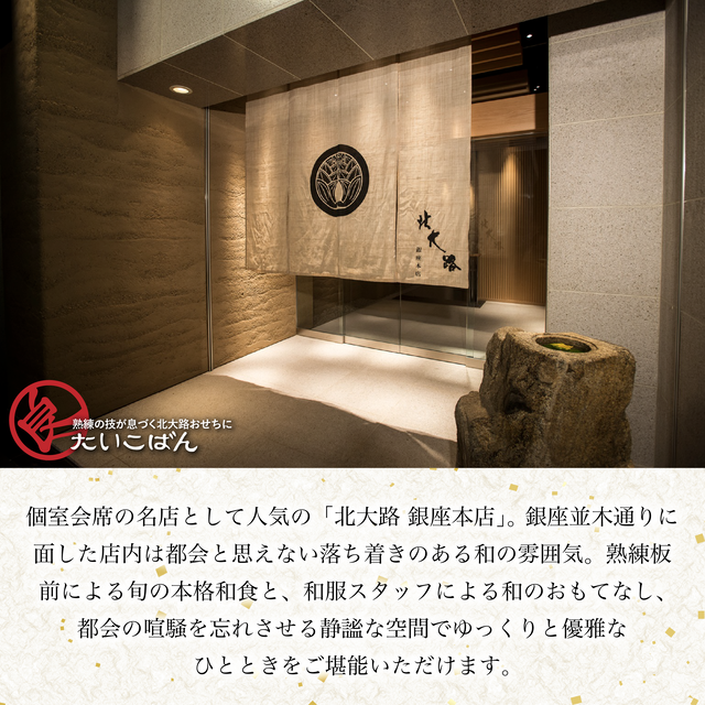個室会席の名店として人気の「北大路 銀座本店」。 銀座並木通りに面した店内は都会と思えない落ち着きのある和の雰囲気。熟練板前による旬の本格和食と、和服スタッフによる和のおもてなし、 都会の喧騒を忘れさせる静謐な空間でゆっくりと優雅なひとときをご堪能いただけます。