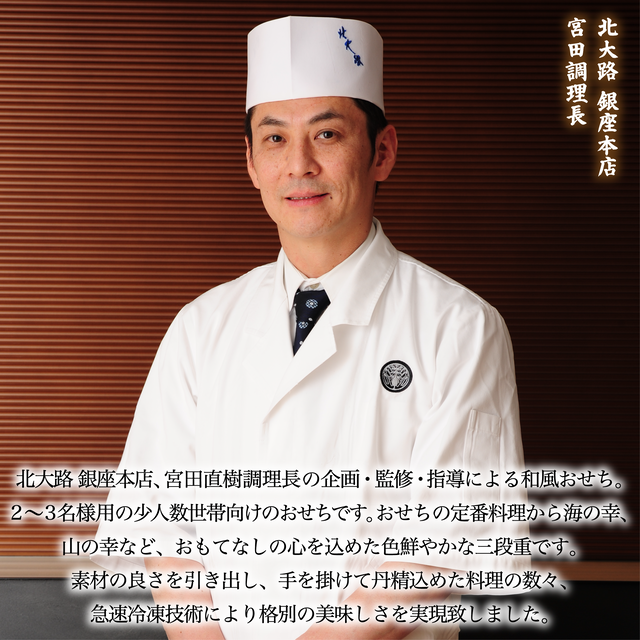 北大路 銀座本店、宮田直樹調理長の企画・監修・指導による和風おせち。2〜3名様用の少人数世帯向けのおせちです。おせちの定番料理から海の幸、山の幸など、おもてなしの心を込めた色鮮やかな三段重です。