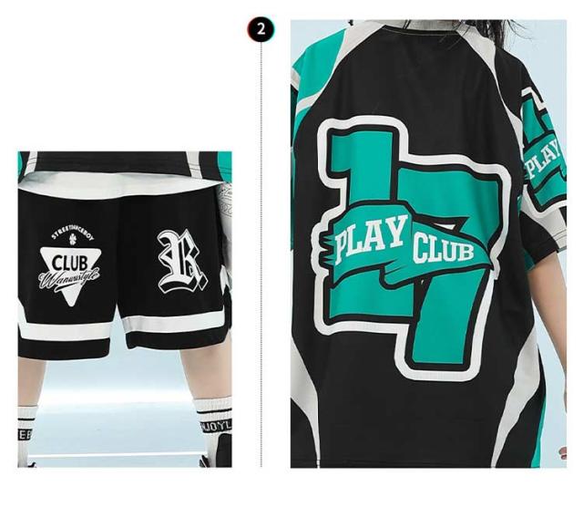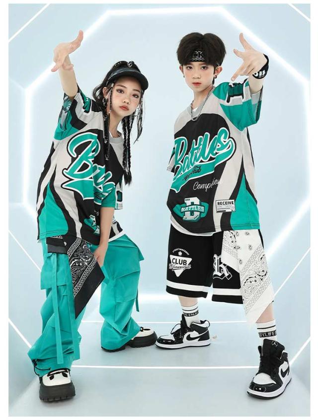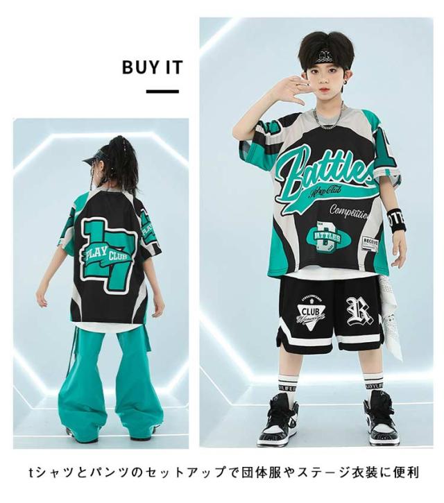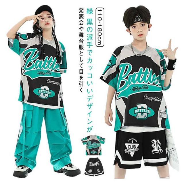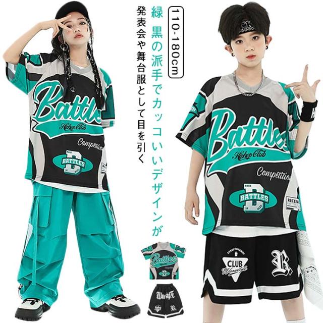緑 黒 レーシング tシャツ キッズ ダンス衣装 セットアップ ストリート 派手 女の子 男の子 半袖 ゆったり トップス 短パン カーゴパンツ チアガール hiphop jazz ジャズダンス ヒップホップ かっこいい おしゃれ 韓国 k-pop 演出服 発表会 団体服 応援団
