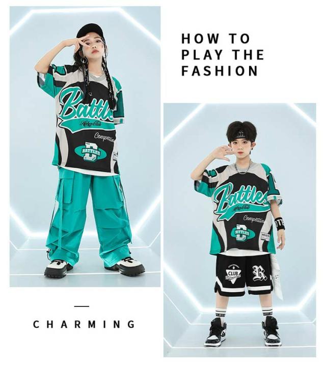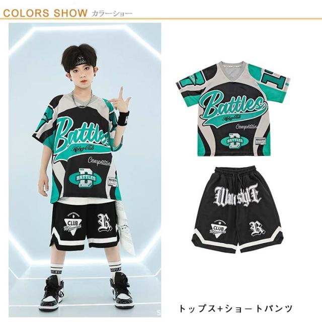 | 緑 黒の派手でカッコいいデザインが発表会や舞台服として目を引く キッズダンス衣装セットアップで男の子向けのストリートダンスやヒップホップに最適 ゆったりとしたデザインで動きやすく夏用やカジュアルシーンにもぴったり tシャツとパンツのセットアップで団体服やステージ衣装に便利 男児向けのサイズでストリートダンスやヒップホップファッションに最適 | |