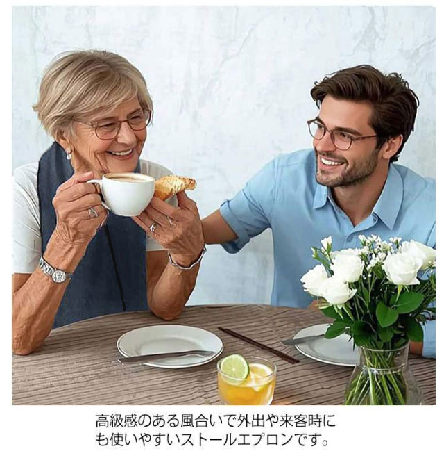 | スカーフのように見える、おしゃれな食事用エプロン 2枚セット 介護のシーンでも「おしゃれを楽しみたい」という思いを叶えるストール風エプロン。 高級感のあるデザインで、まるでファッションアイテムのように自然に身につけられます。 タオル地のやわらかい素材で吸水性抜群。食べこぼしや飲み物をしっかり吸収し、衣服を汚れから守ります。洗濯機で丸洗いできるので、いつでも清潔をキープできます。 高級感のある風合いで外出や来客時にも使いやすいストールエプロンです。 こんな方におすすめ ・介護中でもおしゃれに見えるエプロンを探している方 ・高齢のご家族への贈り物やプレゼントに ・外出先や来客時でも自然に使える高級感ある食事用エプロンを求める方 ・食べこぼしをしっかり吸収して、衣服を守りたい方 | |