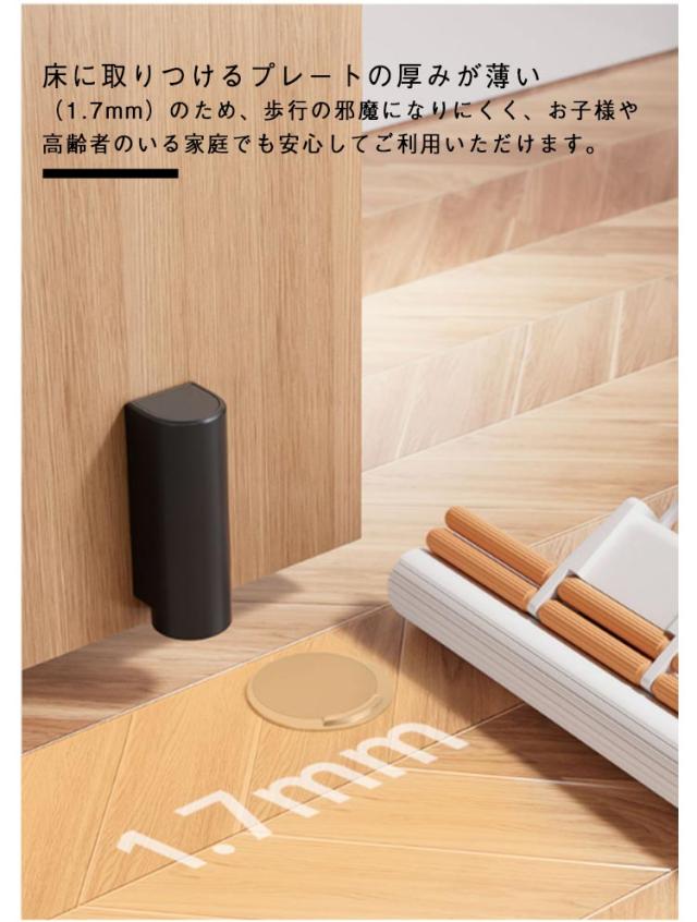 | スリムでインテリアに損わない、歩行の邪魔にならない。 お得な2個セット・マグネット式ドアストッパー。 磁石でピタッと扉をキャッチし、風や衝撃でドアが勝手に閉まるのを防ぎます。 家具や壁紙を保護でき、ドアによる騒音を防ぐマグネット式ドアストッパーです。 ドアに取付けたストッパー部分が床に取付けたプレートの上にくると、マグネットの磁力でドアの動きを止めてくれ、壁や家具などに傷がつくのを防げます。 床に取りつけるプレートの厚みが薄い(1.7mm)のため、歩行の邪魔になりにくく、お子様や高齢者のいる家庭でも安心してご利用いただけます。 床付けタイプで安定感抜群!スリム&極薄設計なので、邪魔にならず室内にすっきり設置できます。 両面テープで貼り付けるだけの簡単設置、工具や穴あけ不要で女性一つでも簡単に取り付けできます。 おしゃれ&スリムなドアストッパー。安全・快適な暮らしをサポートします。 | |