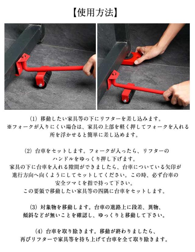 | ・普段運べない大きな家具などをらくらく移動♪ ・引っ越しに!お掃除に!1人で家具の移動ができる! ・テコの原理で家具を持ち上げ、キャスターを差し込んでラクラク移動できます。 ・耐荷重は150kgです。 【使用方法】 (1)移動したい家具等の下にリフターを差し込みます。 ※フォークが入りにくい場合は、家具の上部を軽く押してフォークを入れる所を浮かせると簡単に差し込めます。 (2)台車をセットします。フォークが入ったら、リフターのハンドルをゆっくり押し下げます。 家具の下に台車を入れる隙間ができましたら、台車についている矢印が進行方向へ向くようにして セットしてください。この時、必ず台車の安全ツマミを指で持って下さい。 この要領で移動したい家具等の四隅に台車をセットします。 (3)対象物を移動します。台車の進路上に段差、異物、傾斜などが無いことを確認し、ゆっくりと移動して下さい。 (4)台車を取り除きます。移動が終わりましたら、再びリフターで家具等を持ち上げて台車を全て取り除きます。 | |