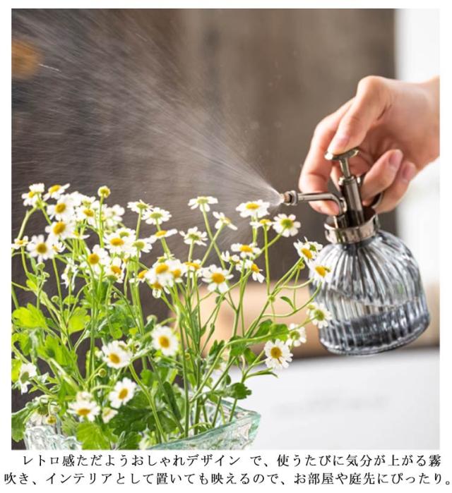| 玄関やお部屋に溶け込む高級感のあるラス霧吹き。 2個セット どこか懐かしい気持ちを思い起こす優しいフォルムは、毎日の水やりが楽しくなる。 レトロ感ただようおしゃれデザイン で、使うたびに気分が上がる霧吹き、インテリアとして置いても映えるので、お部屋や庭先にぴったり。 ノズルが細長いため、植物の根、特に小さな葉が多いものに正確に水を注入できます。 軽い力押すだけで、スプレーでき、ウォーターミストは細かく均一で、観葉植物の水やり(葉水)や、アイロンがけ、窓拭きやお掃除用などに活躍します。 毎日のお手入れが楽しくなる「おしゃれ霧吹き」、植物好きな方へのプレゼントにもおすすめです。 | |