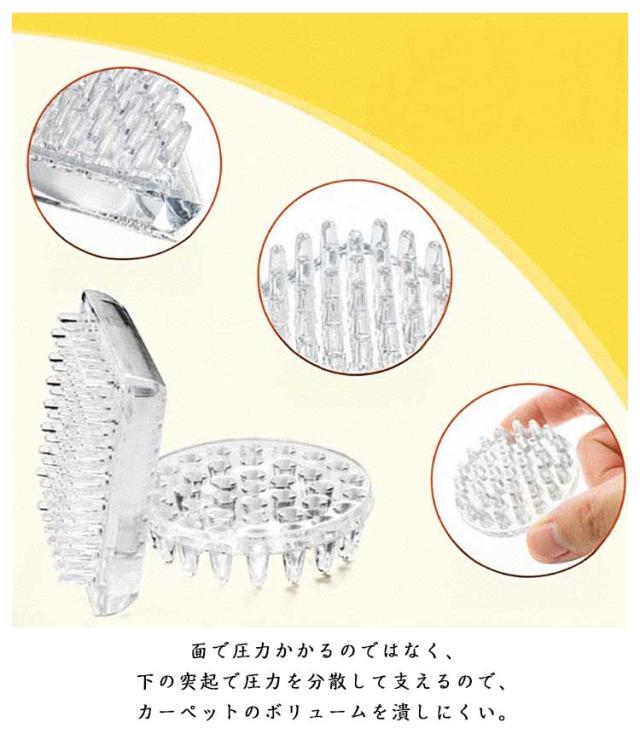 | カーペット・絨毯専用 脚カバー 12個セット ソファや椅子の重みで「カーペットが潰れる」「ズレてシワになる」そんな悩みを解消! カーペット専用設計で絨毯の毛並みを押し潰しにくく、美しさをキープ。 面で圧力かかるのではなく、下の突起で圧力を分散して支えるので、カーペットのボリュームを潰しにくい。 椅子やソファの移動時も安定、カーペットのヨレを防ぐ。 キズや跡が残りにくく、大切な床・カーペットを保護。 お家はもちろん、オフィスのカーペット敷き環境にも重宝する間違いなしのカーペット専用椅子足カバー。 | |