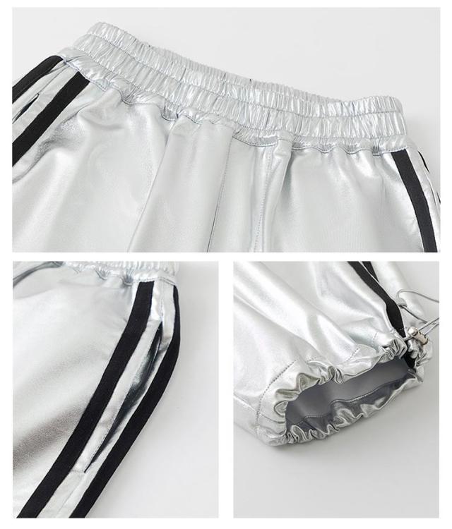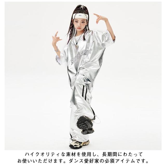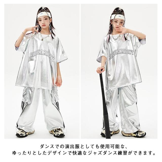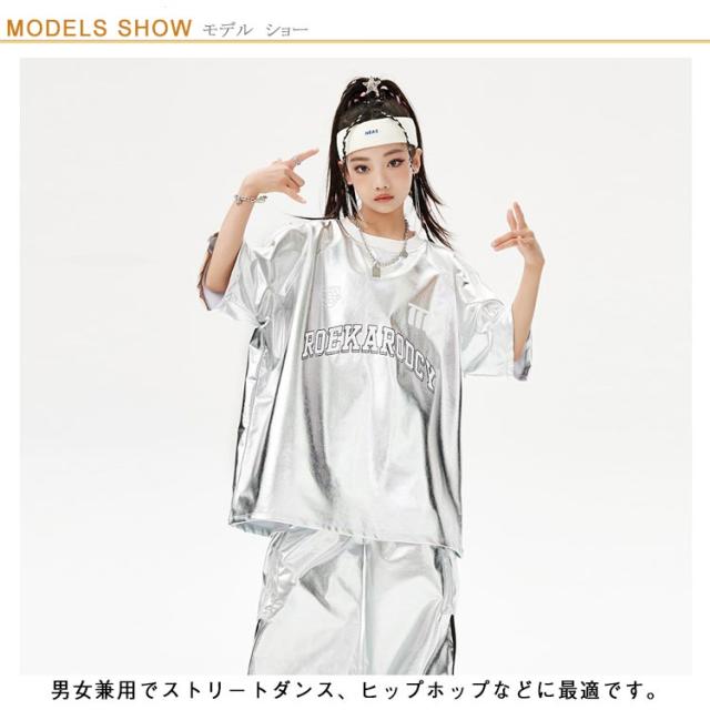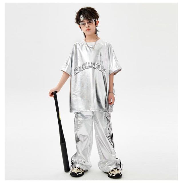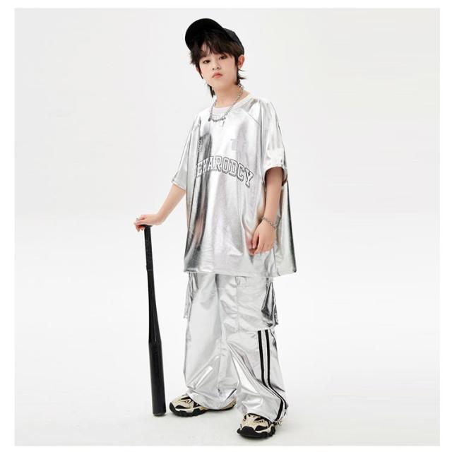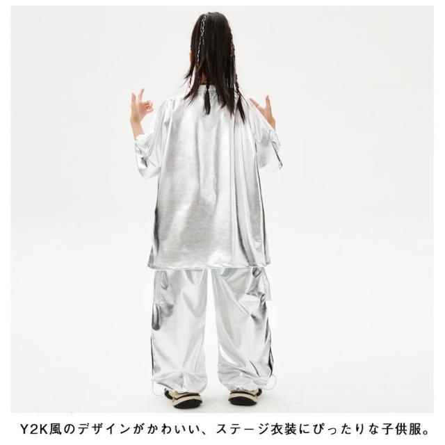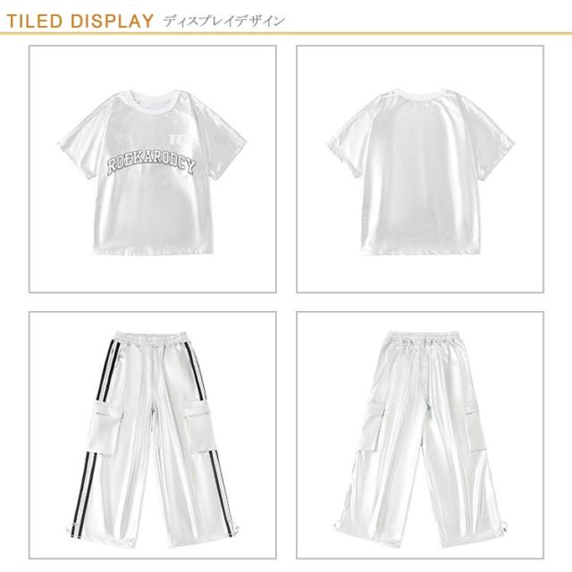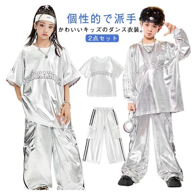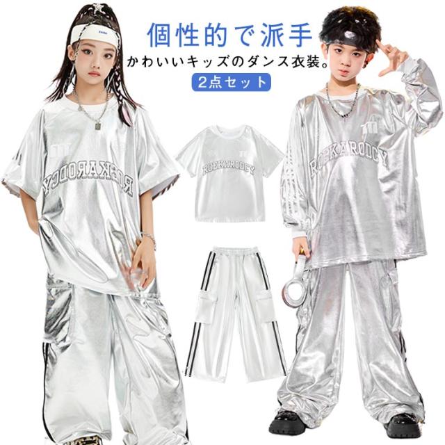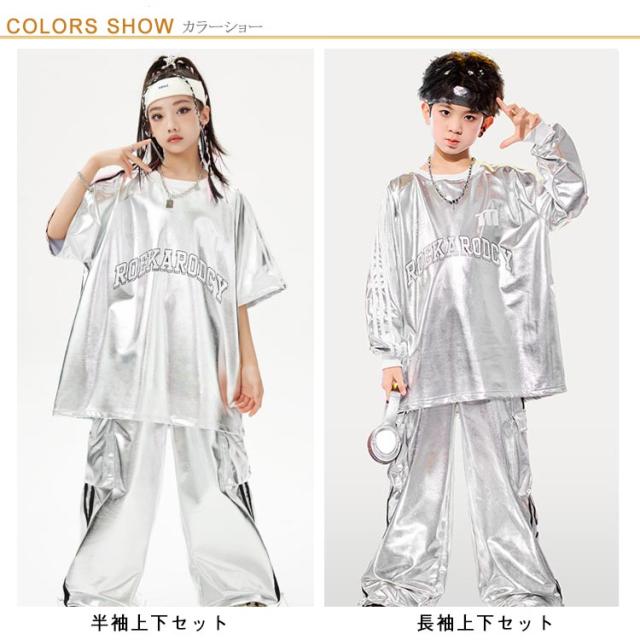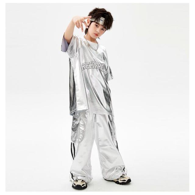 男の子 女の子 子供 シルバー カーゴパンツ セットアップ シルバー キラキラ キッズ ジャズダンス 長袖 半袖 おしゃれ Tシャツ 上下セット かっこいい ヒップホップ jazz ダンス衣装 k-pop 舞台服 演出服 練習着 団体服 発表会 応援団