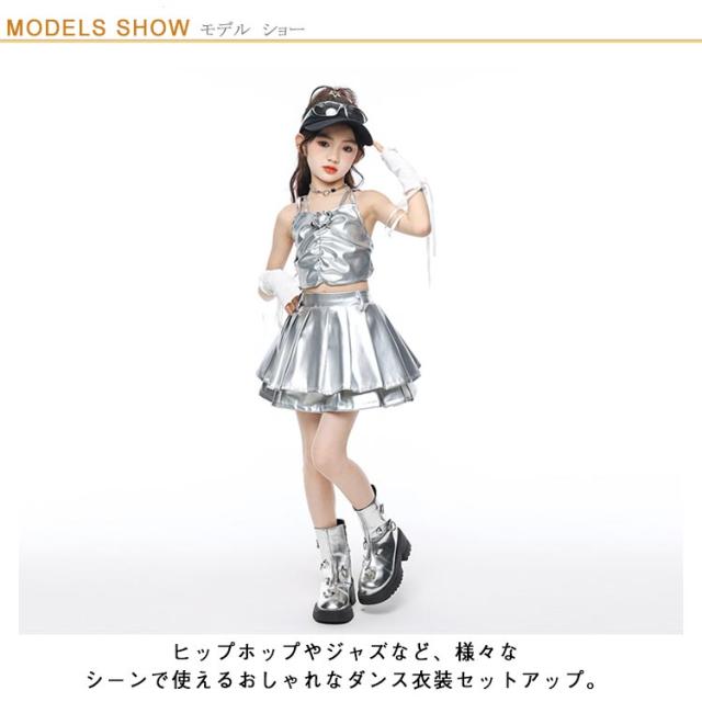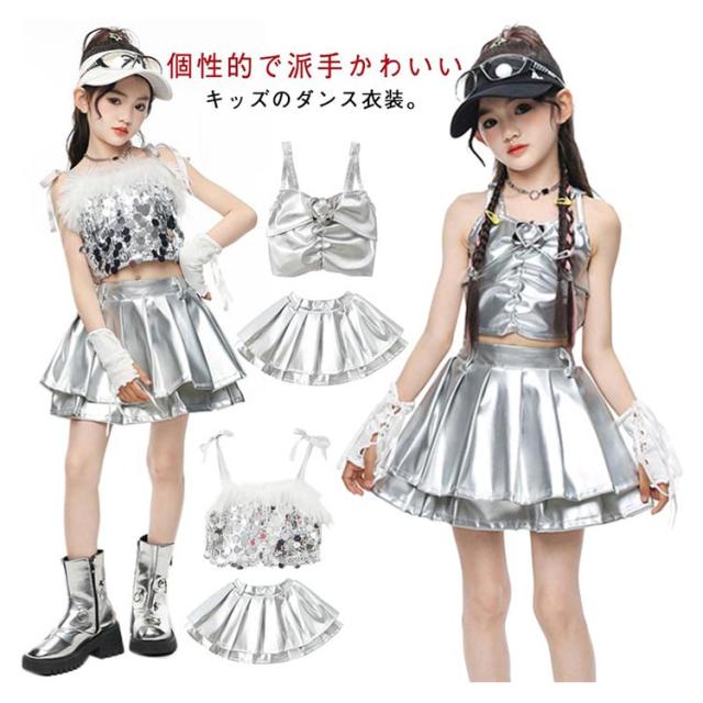 スカート ダンス衣装 3点セットアップ シルバー シルバー キャミソール スパンコール 舞台 子供服 キッズ 団体服 女の子 かわいい チアダンス Hiphop k-pop ヒップホップ 演出服 ステージ衣装 ジャズダンス jazz 発表会 応援団 ラムショー 公演服