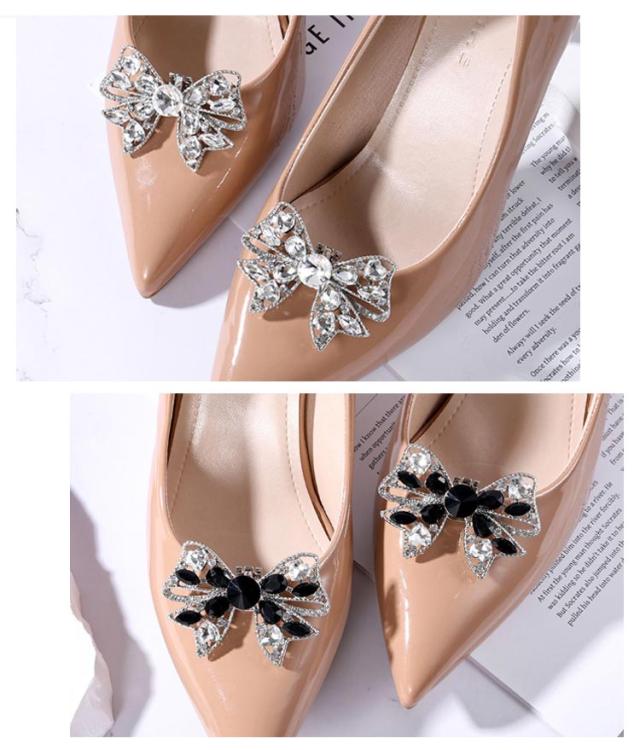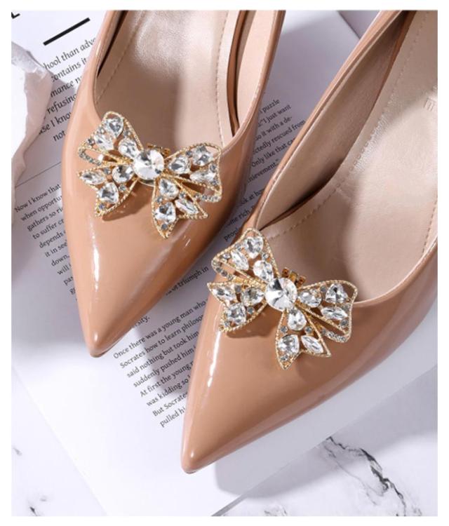 | かわいいリボンデザインのワンタッチシューズクリップ。 キラキラフェイク水晶デザインで上品さを演出 無地のパンプスしか持っていない方必見!お手持ちのパンプス/ヒールにワンタッチで簡単装飾♪ 2個セットですので、靴以外にも帽子やクラッチバッグ、ジャケットのドレスアップにも便利です♪ 「いつものパンプスがワンタッチでブライダル仕様に。」 | |