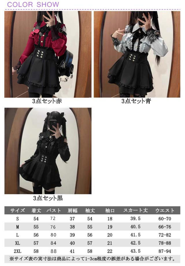 | サイズについての説明 | 3点セット:「長袖ブラウス」+「ミニスカート」+「リボンブローチ」 ※サイズ表の実寸法は商品によって1-3cm程度の誤差がある場合がございます。 |