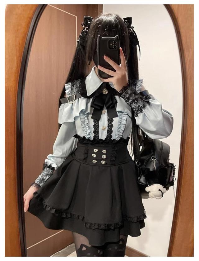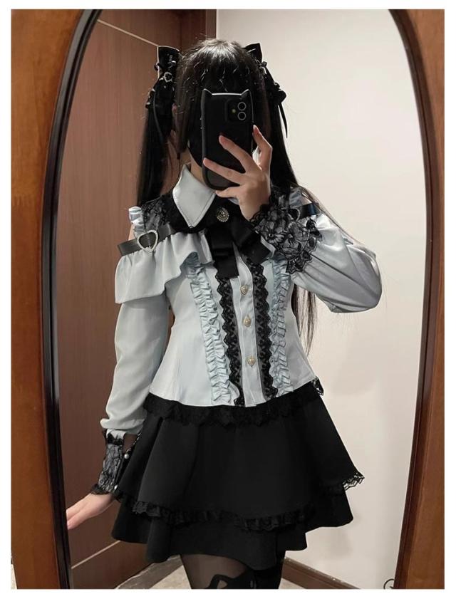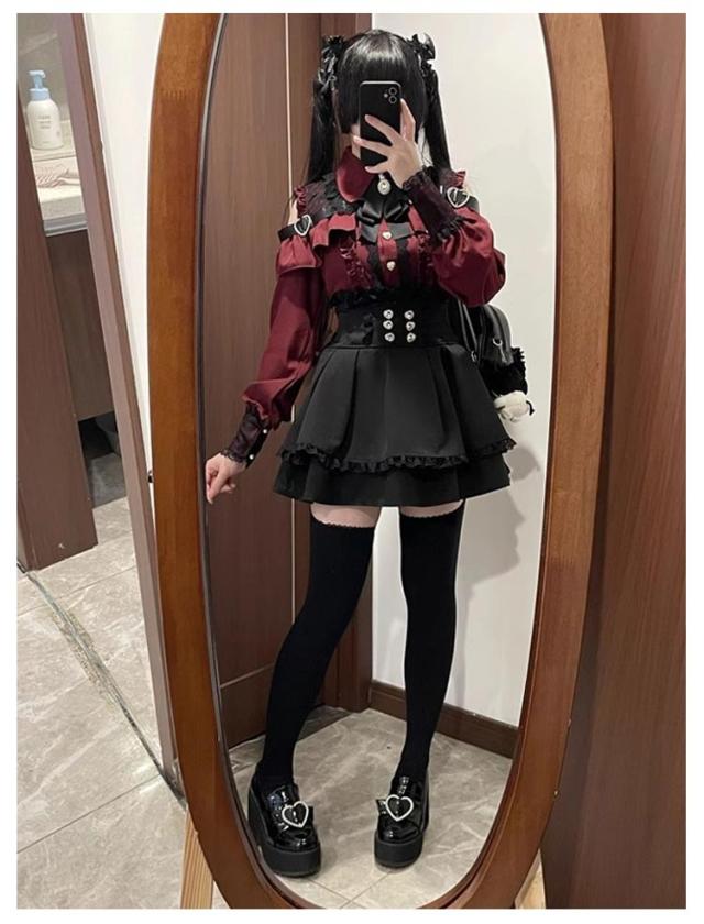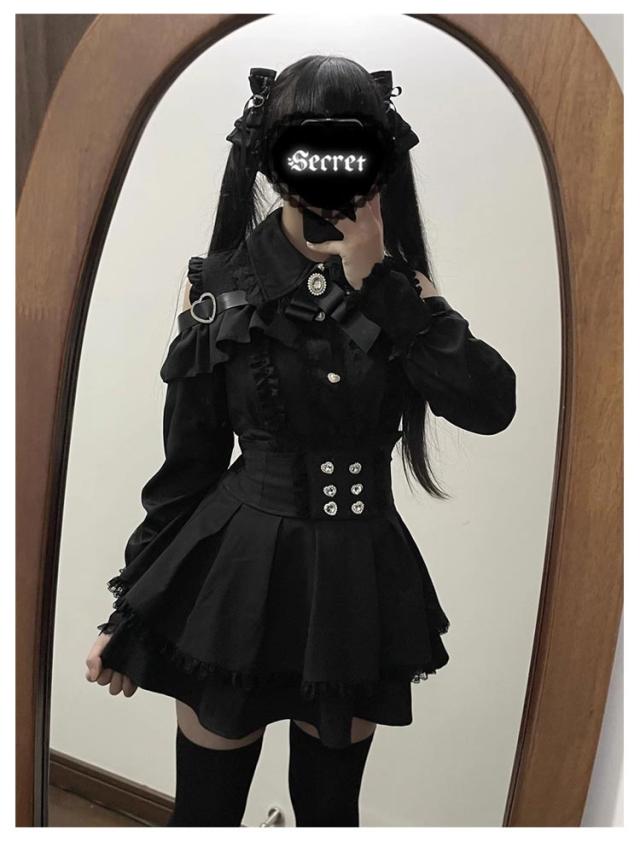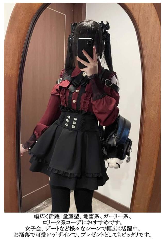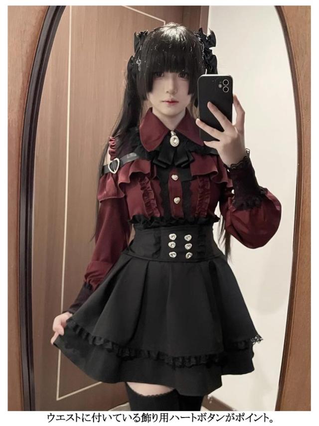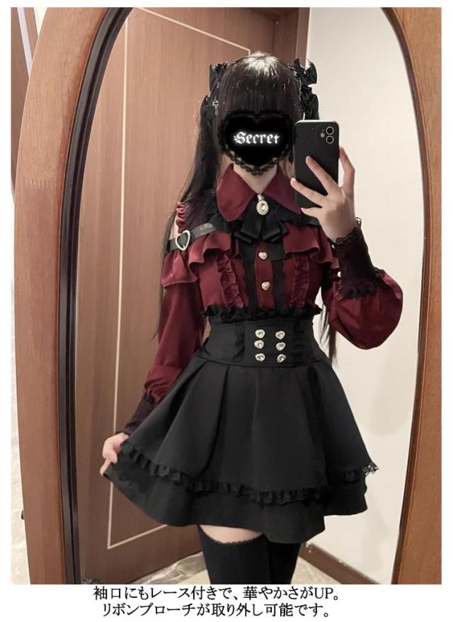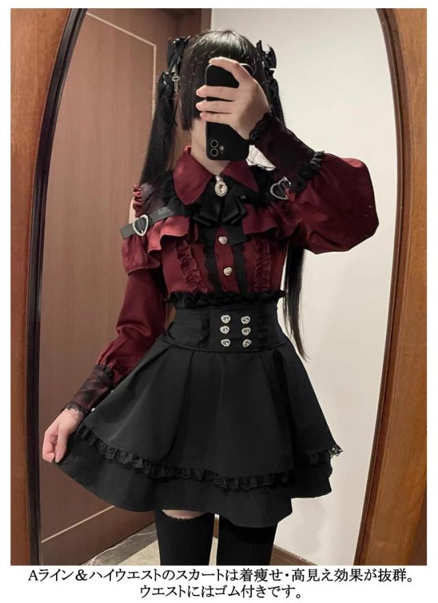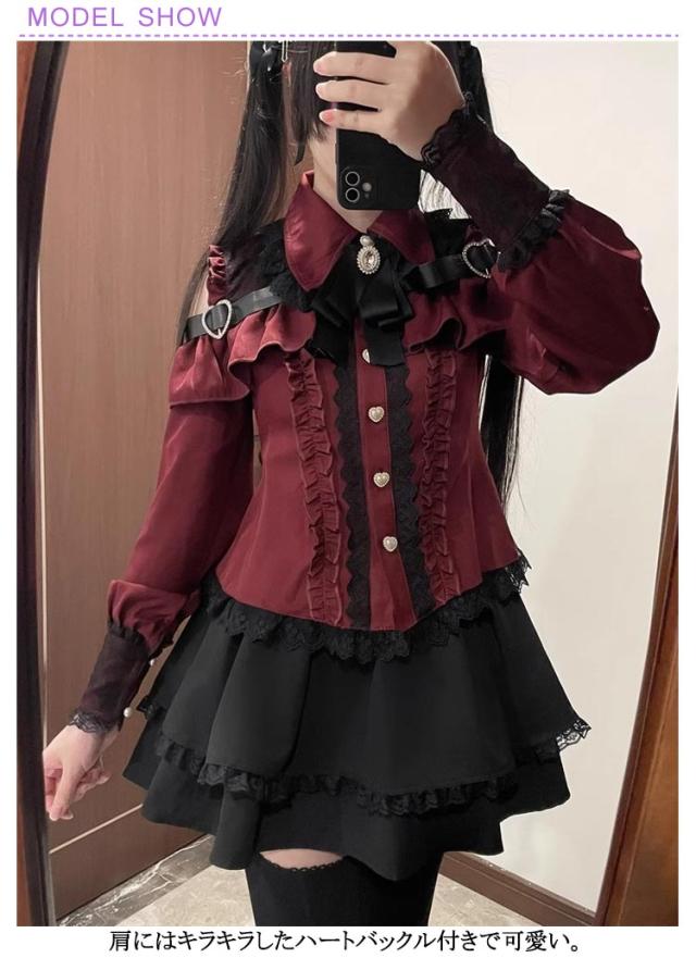 レディース オープンショルダー 病みかわいい 地雷系 ハートバックル 服 レース ガーリー系 フリル 量産型 長袖 肩出しブラウス 立ち襟 セットアップ スカート 可愛い Aライン オープンショルダー フレンチ お姫様 リボン ロリータ ギャル おしゃれ 春 夏 秋