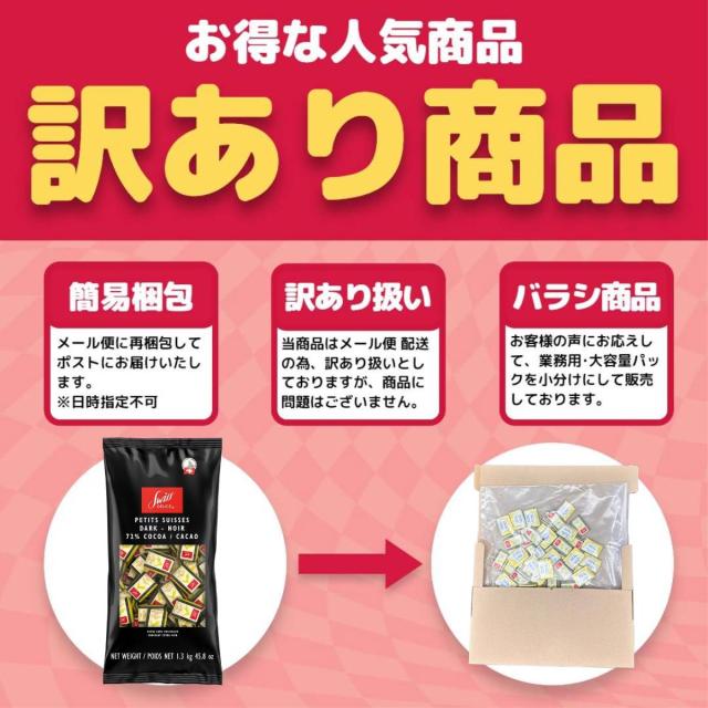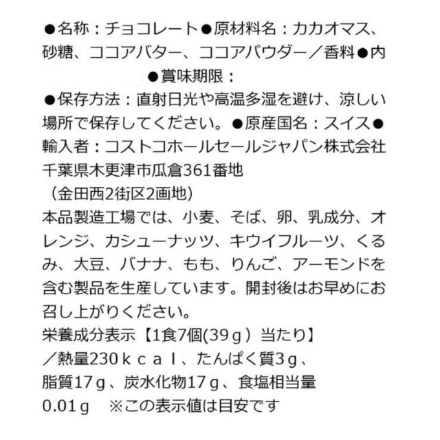 | その他 | ・スイスの有名チョコレートブランド「スイスデリス」の、クリーミーで本格的なダークチョコレートをお楽しみください。 ・ひと粒ずつ個別装になっているのでコーヒーブレイクのお供や家族・友達とのシェアにもぴったりです。 |