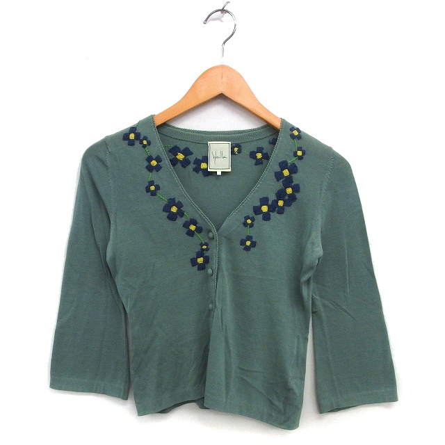【中古】シビラ SYBILLA Vネック カーディガン ニット コットン 綿 クロップド ハイゲージ 花柄 七分袖 M カーキ /NT8