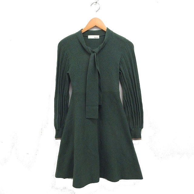 【中古】リリーブラウン Lily Brown ニット フレア ワンピース 長袖 ひざ丈 ボウタイ 無地 F グリーン 緑 /FT4