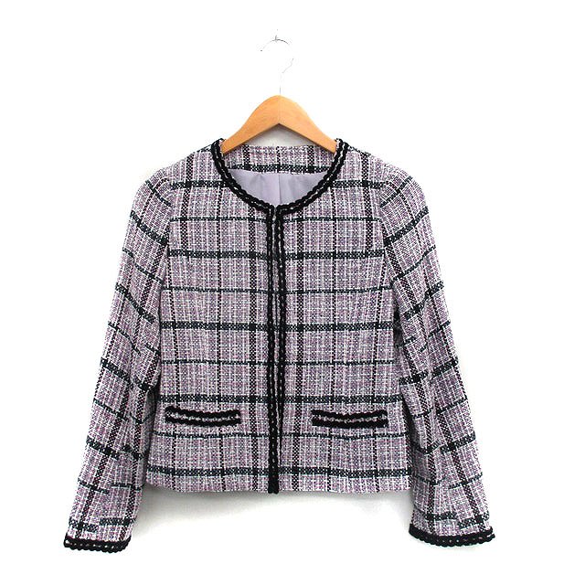 【中古】未使用品 カールパークレーン KarL Park Lane タグ付き ノーカラージャケット ツイード チェック 5 ピンク /KT24 レディース