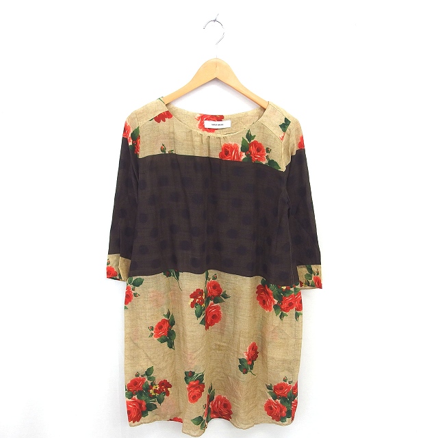 【中古】スーパーハッカ SUPER HAKKA ワンピース 膝下丈 花柄 水玉 ボートネック ウール 薄手 七分袖 ブラウン