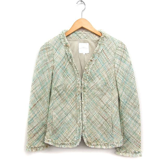 【中古】クミキョク 組曲 KUMIKYOKU ツイード ノーカラー ジャケット フリンジ コットン 綿 2 グリーン 緑 ベージュ