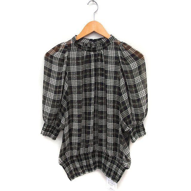【中古】未使用品 ティアラ Tiara タグ付き シアーチェック ブラウス 5分袖 バルーンスリーブ バンドカラー 3 ブラック