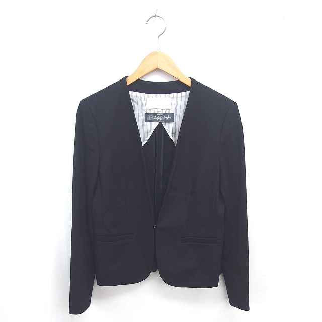【中古】自由区 オンワード樫山 ノーカラー ジャケット アウター 背抜き 肩パッド ウール混 40 黒 ブラック /TT27