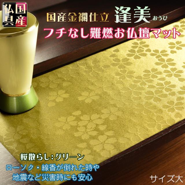 国産仏具【フチなし難炎お仏壇マット:金襴仕立 逢美(おうび)桜散らし・グリーン サイズL】仏壇用仏具 ネコポス便送料無料 防炎マット