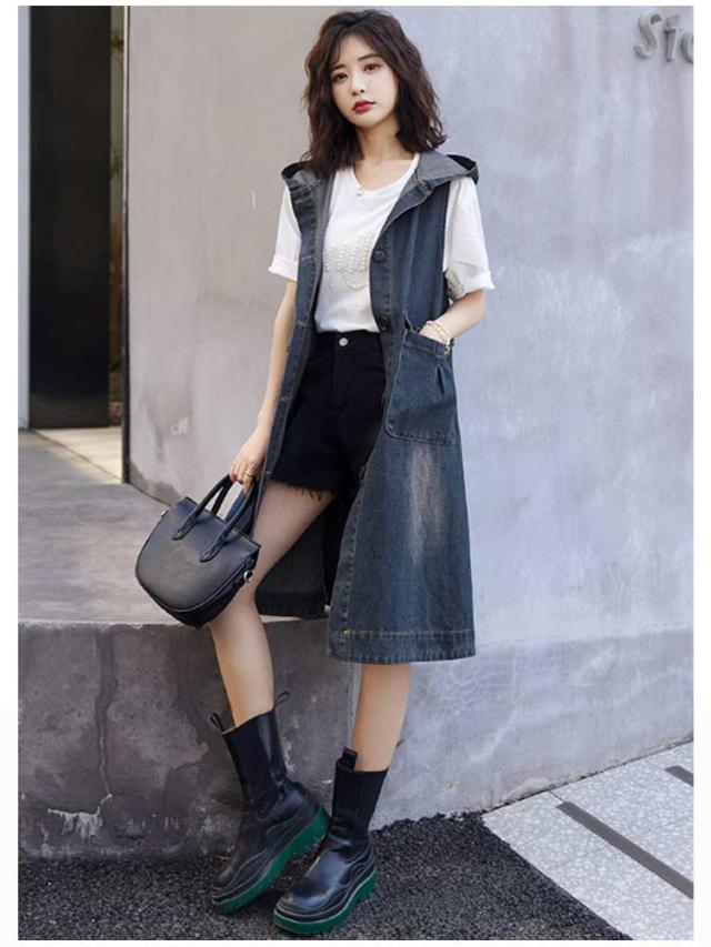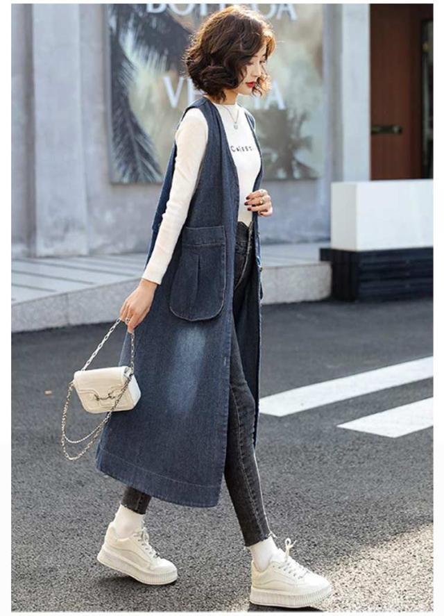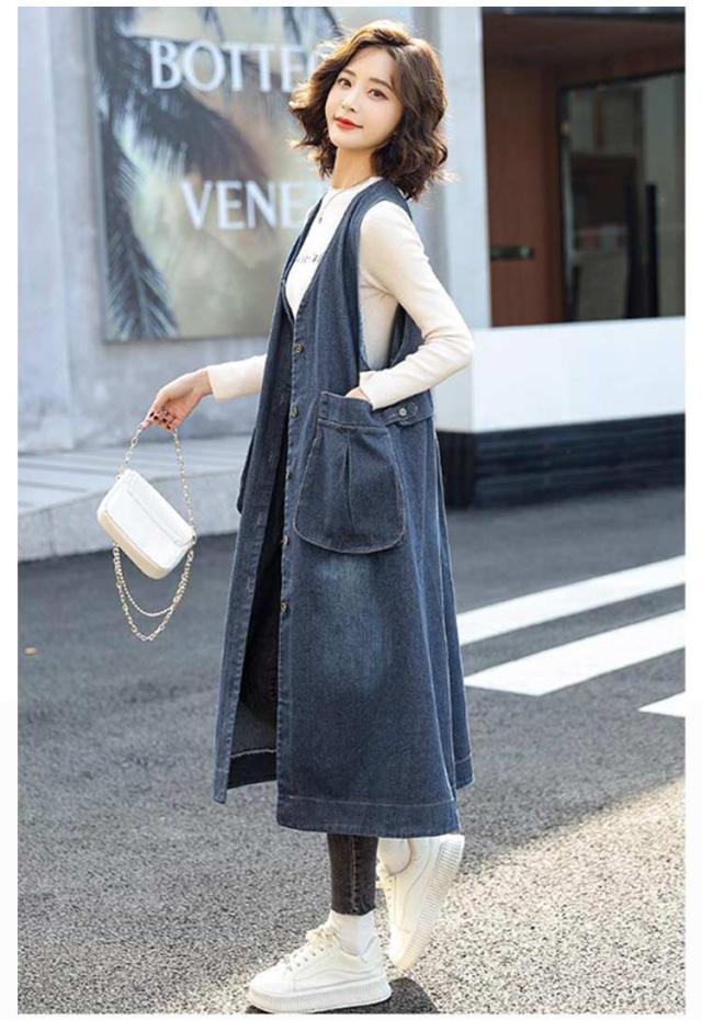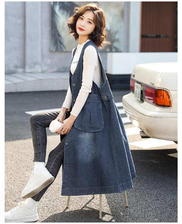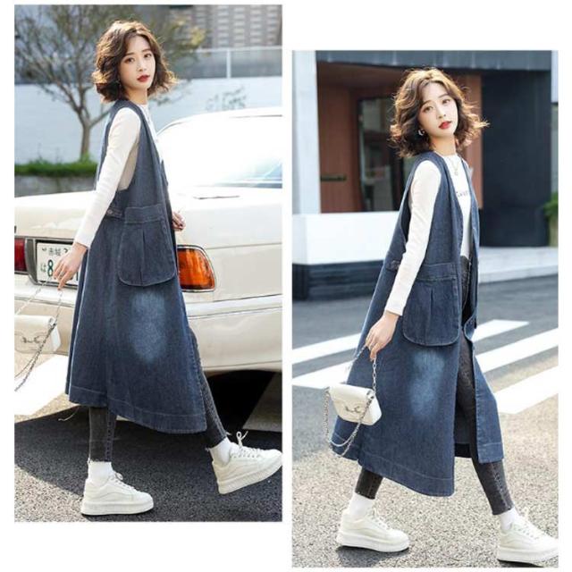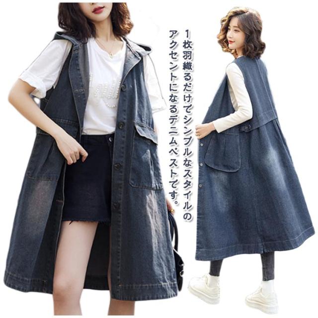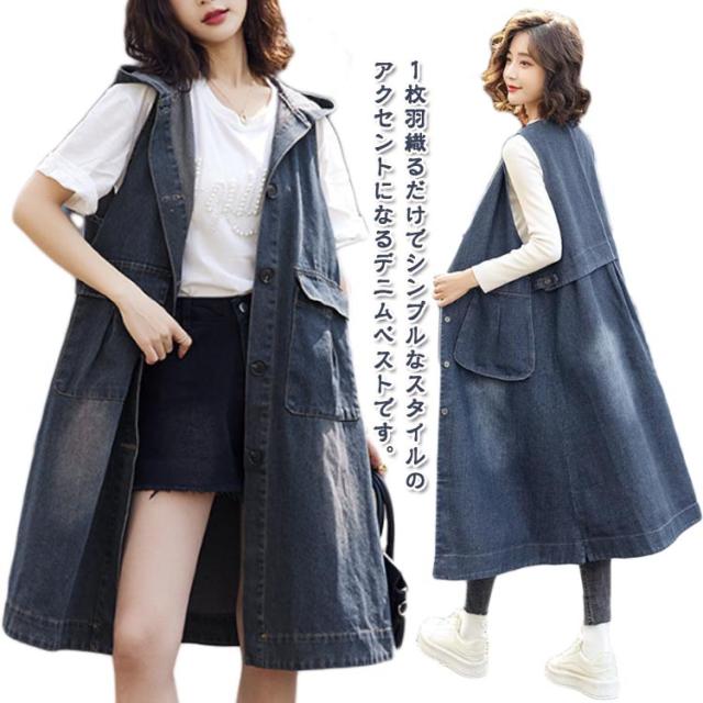 レイヤード ベスト デニムジャケット お尻が隠れる ロングベスト デニムジャケット 前開き ロングジレ ジレ アウター 羽織 きれいめ 着痩せ 体型カバー 2way ジャンパースカート 重ね着 春 秋