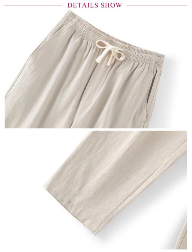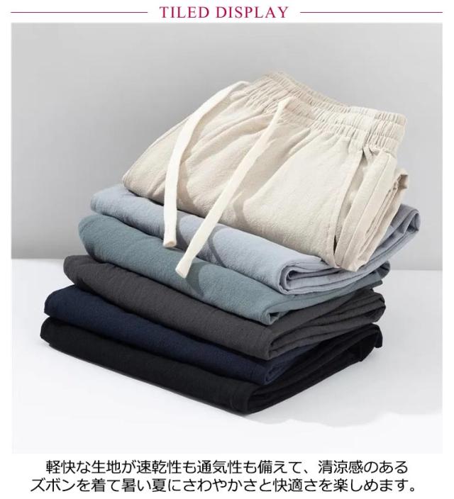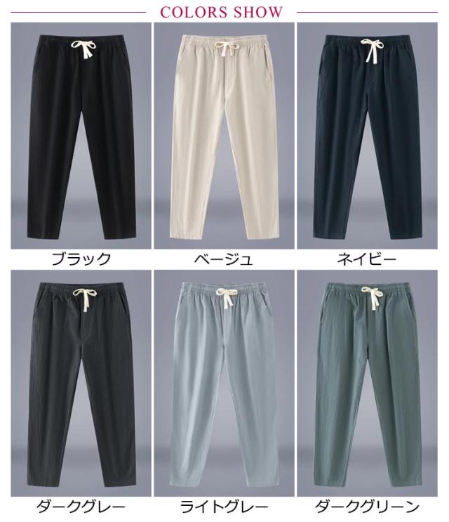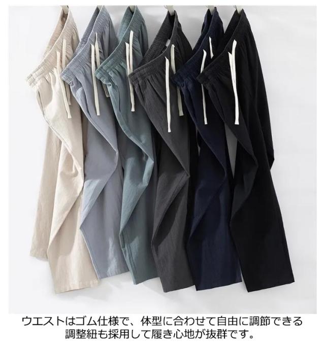 | 夏でも快適に? サラッと肌あたりがよく涼しげなパンツ 軽快な生地が速乾性も通気性も備えて、清涼感のあるズボンを着て暑い夏にさわやかさと快適さを楽しめます。 ウエストはゴム仕様で、体型に合わせて自由に調節できる調整紐も採用して履き心地が抜群です。 普段着、レジャーシーンでの使用が可能で、パジャマやルームウェアとしてもおすすめです。 | |