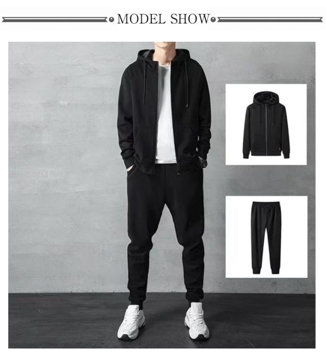 | 普段使いは勿論、部屋着やスポーツにもオススメ上下セットです。 シングルファスナー正面開きで、紐で絞り調整ができるフードがついています。 | |
