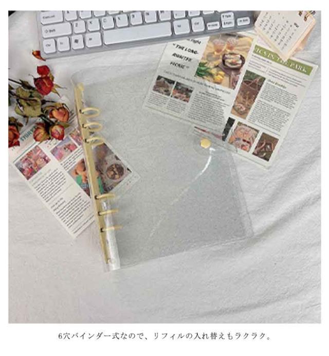 | 手帳用バインダー A5/A6サイズ PVC素材を使用した透明感あふれる手帳カバー。 防水・防汚仕様で、汚れてもサッと拭くだけでお手入れ簡単。 6穴バインダー式なので、リフィルの入れ替えもラクラク。 金属リングは丈夫で長持ちし、日常使いから勉強・仕事まで幅広く活躍します。 可愛いカラーと便利さを両立した、毎日持ち歩きたくなる手帳カバー。 | |