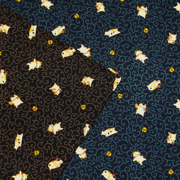 小さめの唐草柄にかわいい猫が描かれた和柄生地。
