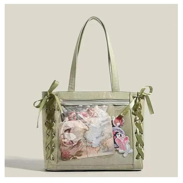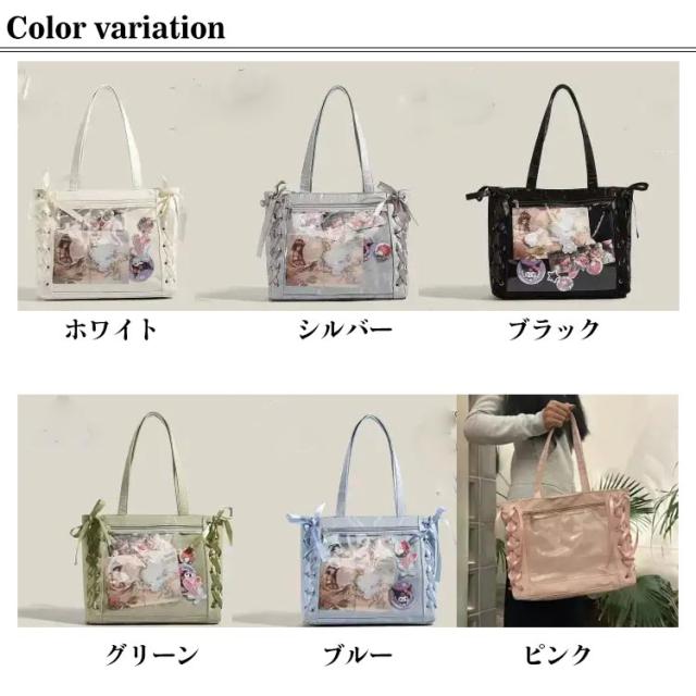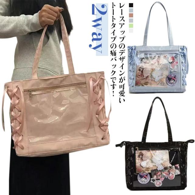 | レースアップのデザインが可愛いトートタイプの痛バックです! 推しの写真、缶バッジ、ストラップなどを入れて自分の好みの痛バにアレンジしてください♪ 前の透明カバーに飾り板が入っていて、自分の好きな小物を入れることができるトートバッグです。 好きな芸能人や、アニメの写真 、缶バッジ、ストラップ、ぬいぐるみ、キーホルダーなどを入れるだけで、 簡単に世界で1つたったのオリジナルバッグの完成です。 A4大容量!見た目以上の収納力、しっかり収納できる。A4雑誌、ipad、教科書、手帳、ファイル、スマホ、傘、化粧品、財布などを入れます。 | |